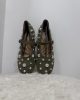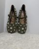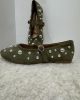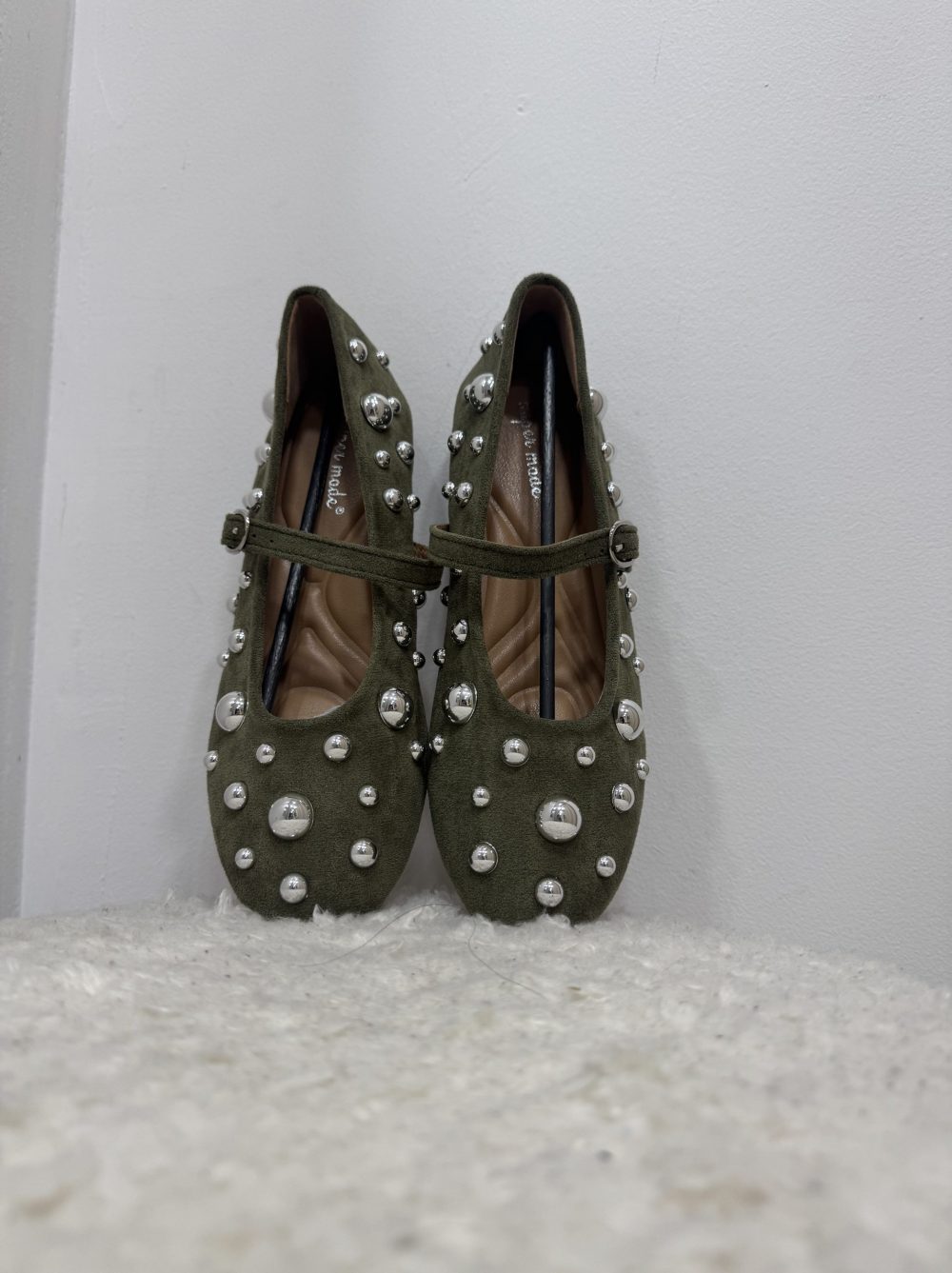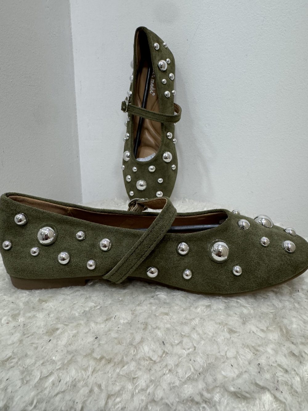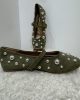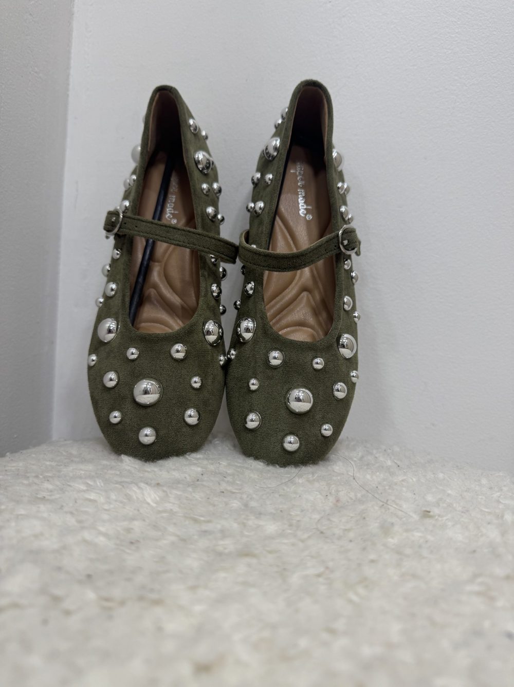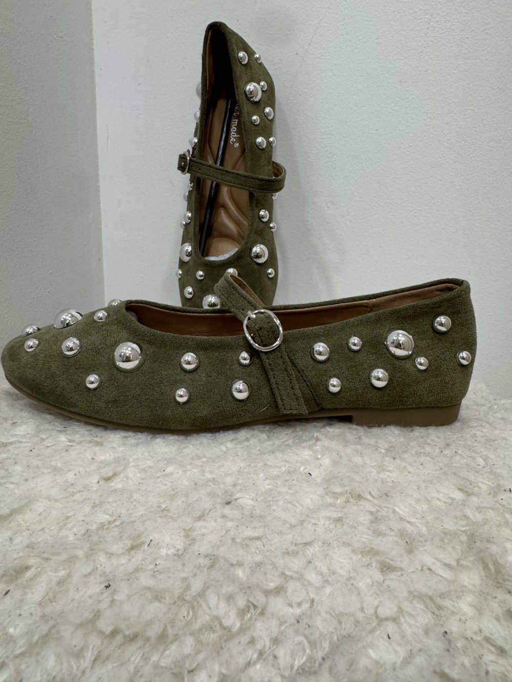 Ballerines plates en suédine vert kaki, décorées de clous argentés de différentes tailles.