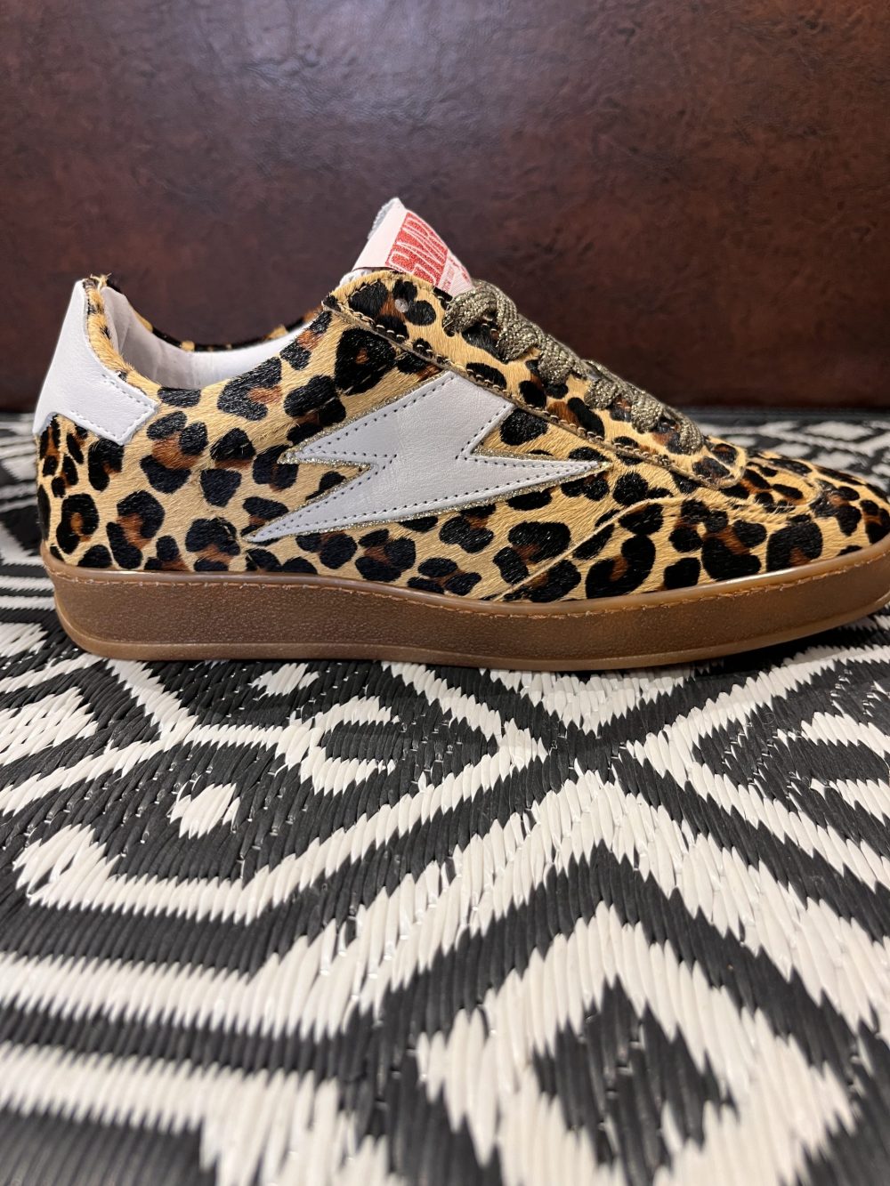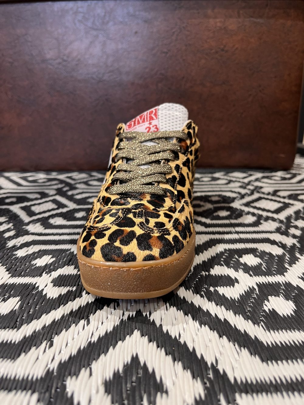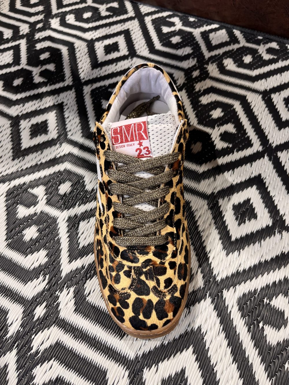 Baskets basses avec empiècement éclair en cuir blanc et empiècement en daim blanc à l’arrière. Le reste de la chaussure présente un aspect fourrure léopard. Surpiqûres, lacets marron foncé lurex, logo SMR rose lurex sur la languette, semelle gomme marron.