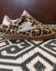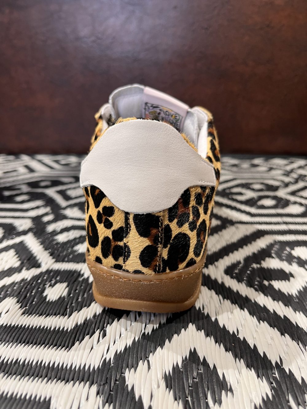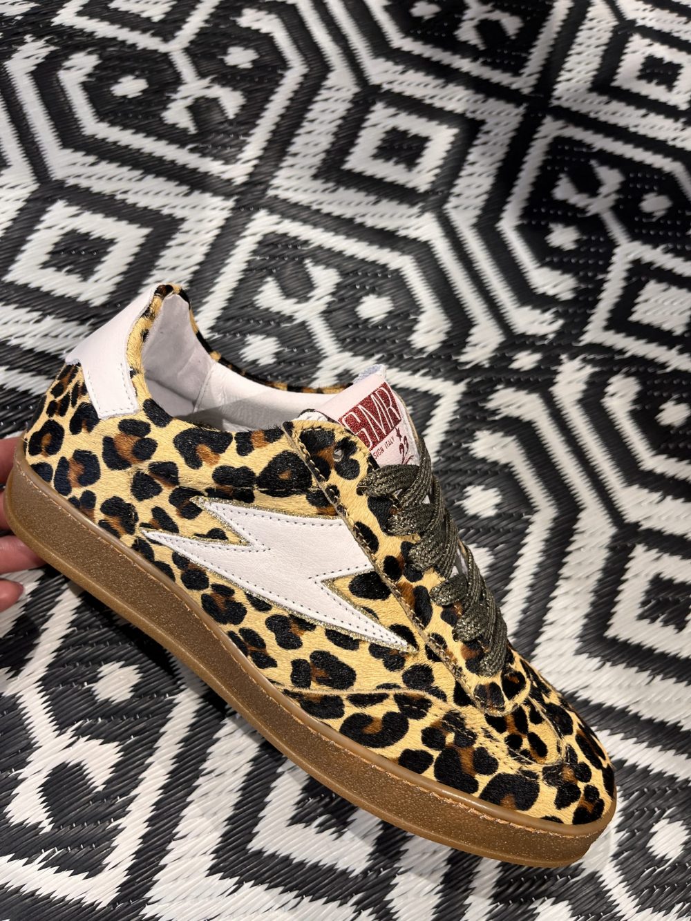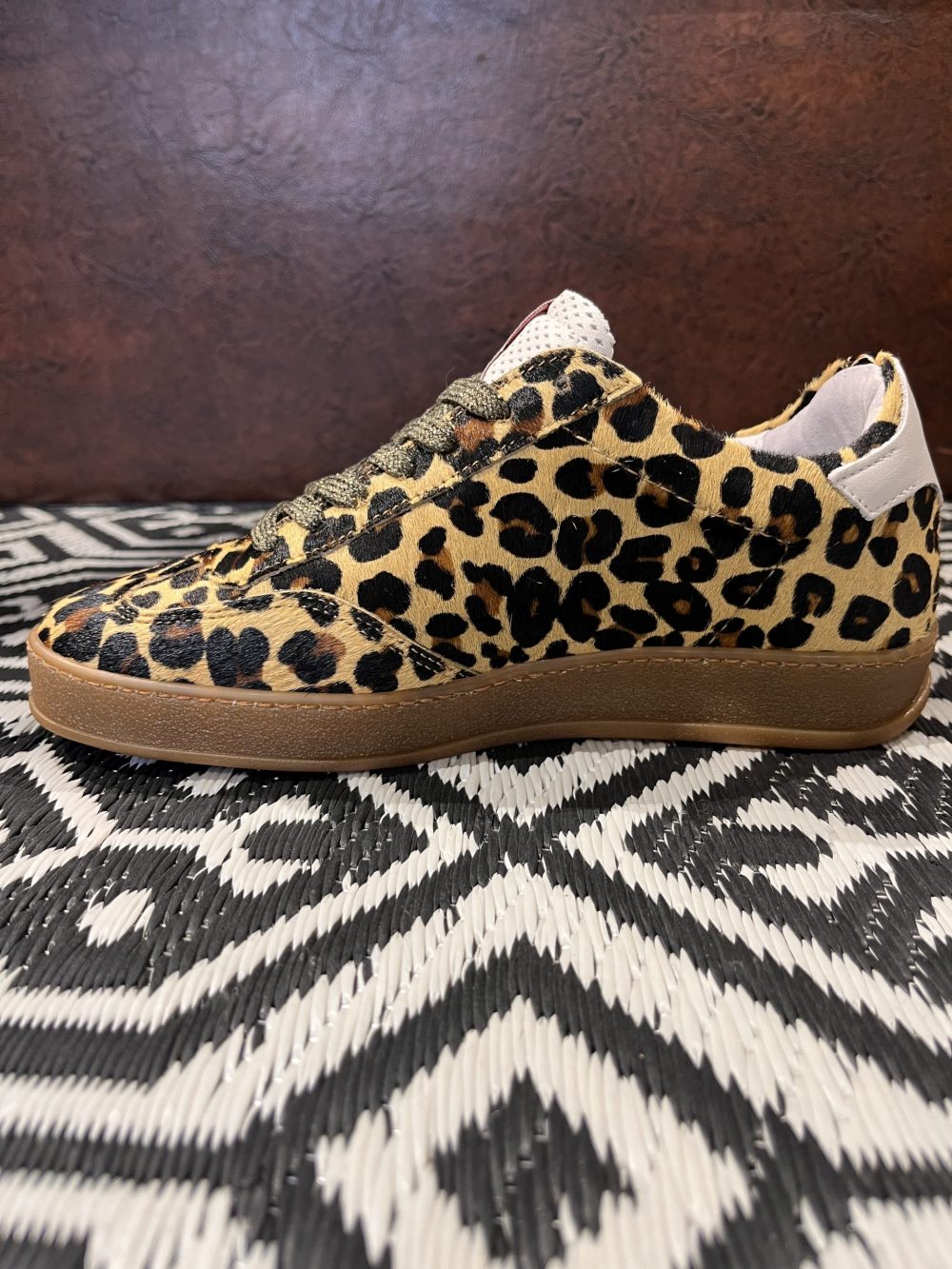 Baskets basses avec empiècement éclair en cuir blanc et empiècement en daim blanc à l’arrière. Le reste de la chaussure présente un aspect fourrure léopard. Surpiqûres, lacets marron foncé lurex, logo SMR rose lurex sur la languette, semelle gomme marron.