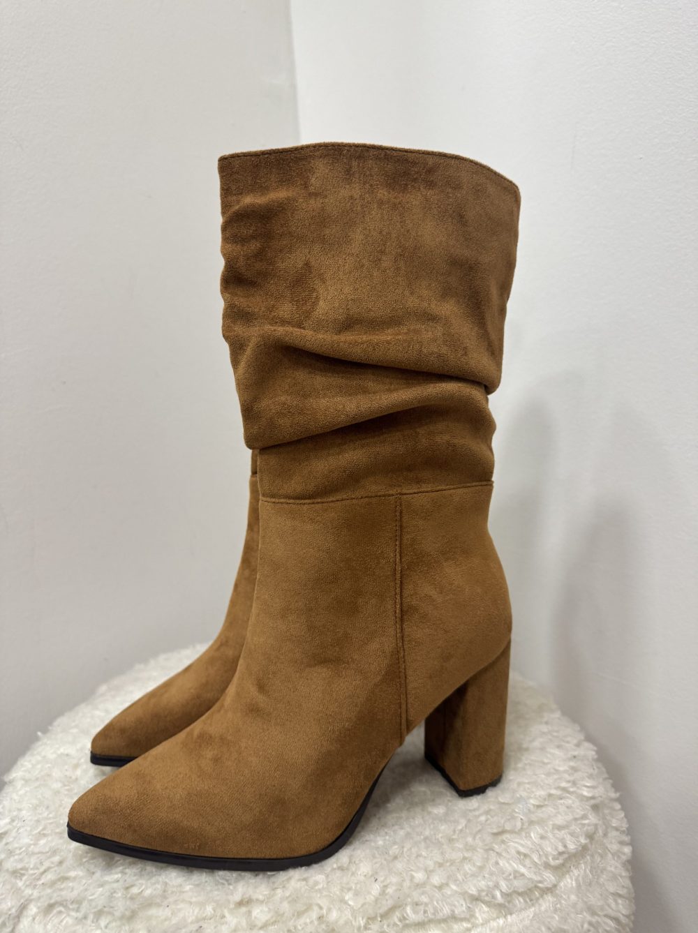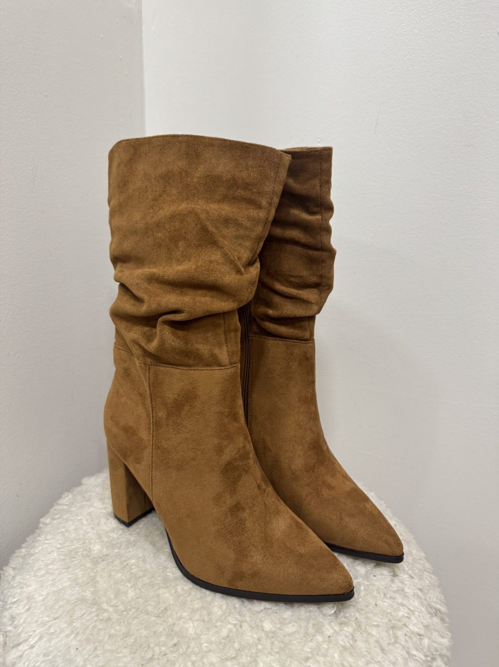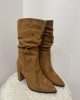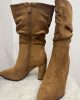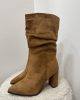 Bottes en suédine camel avec un effet plissé sur la tige. Talon épais et confortable ≈ 8cm
