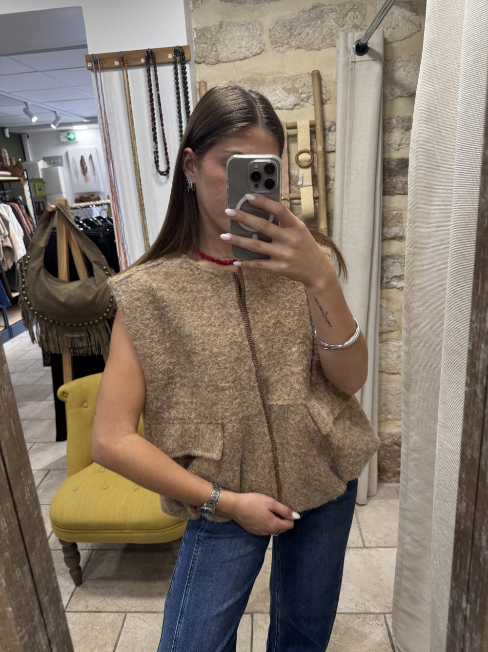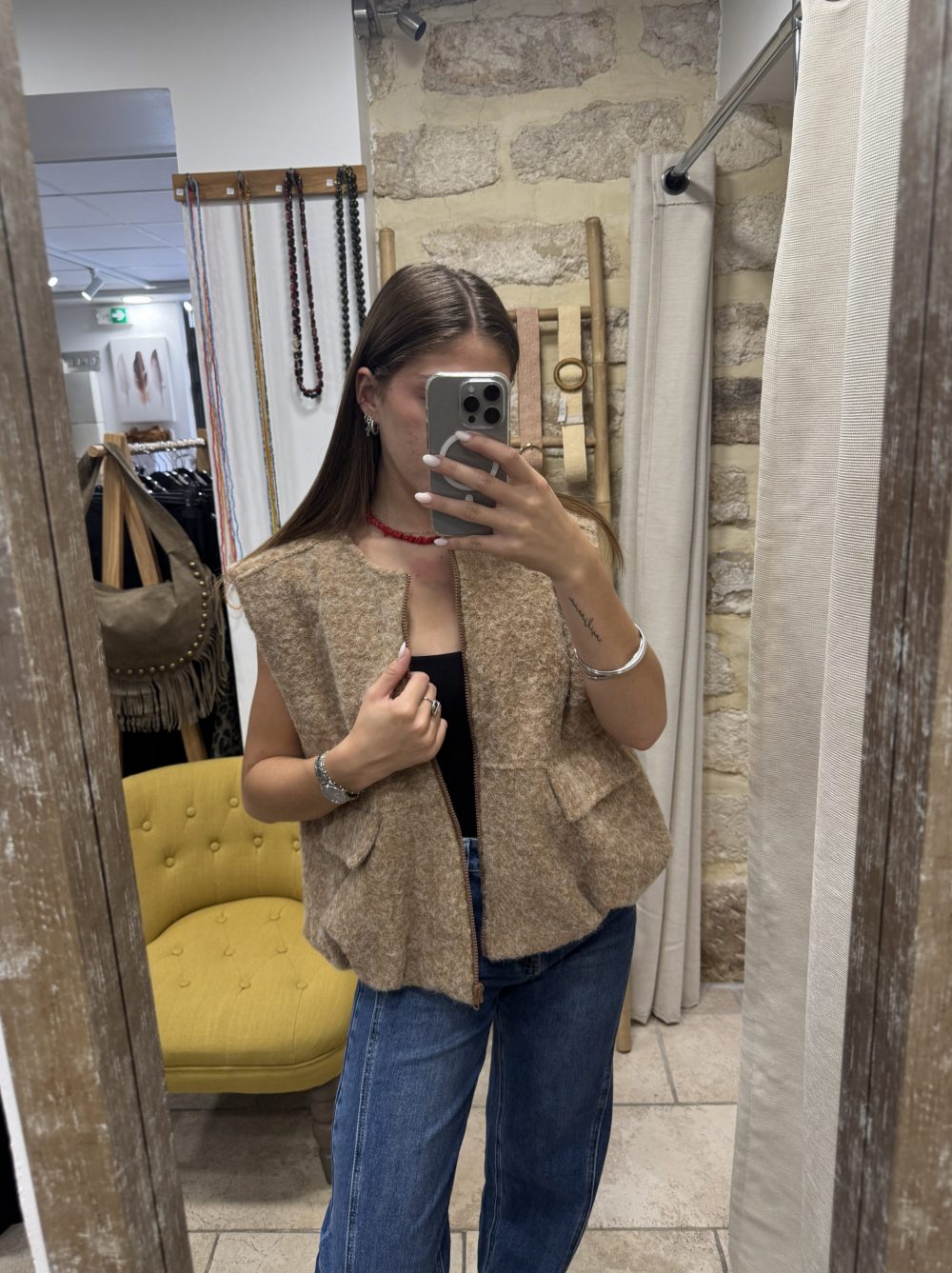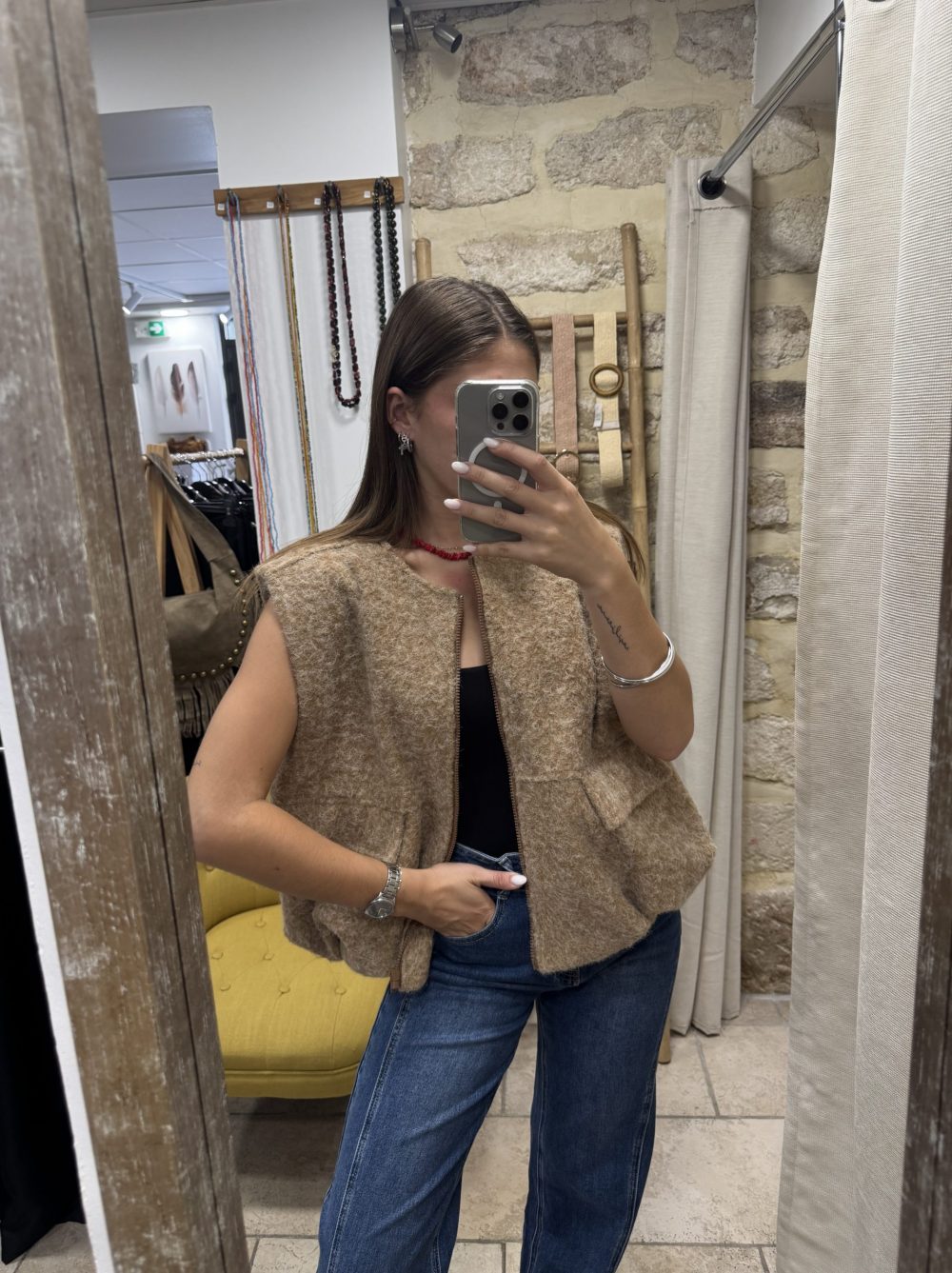 Gilet sans manches en maille beige, fermeture zippée, poches plaquées en relief.