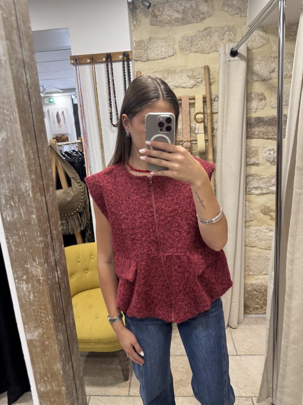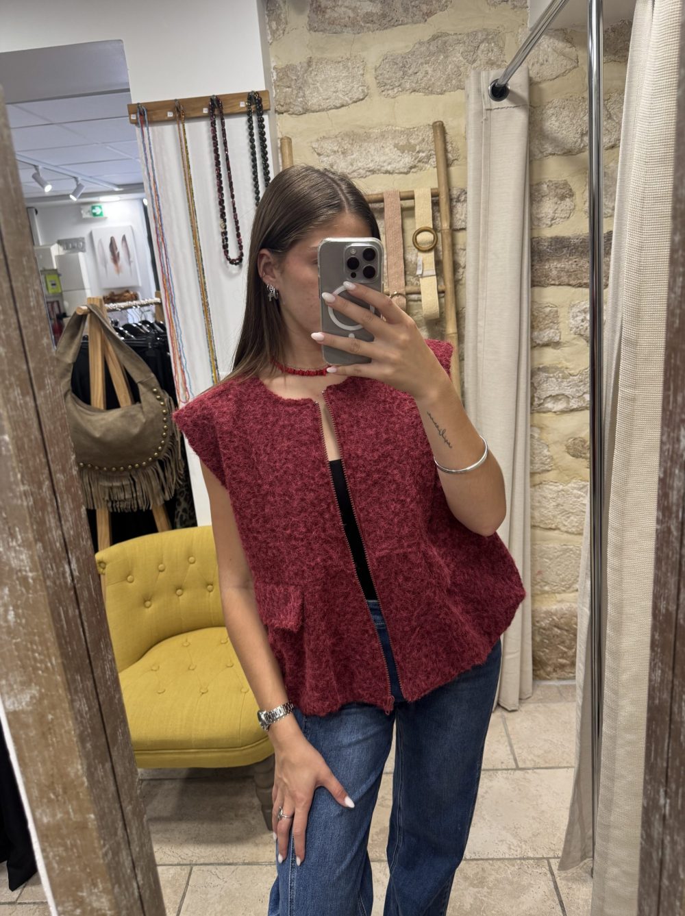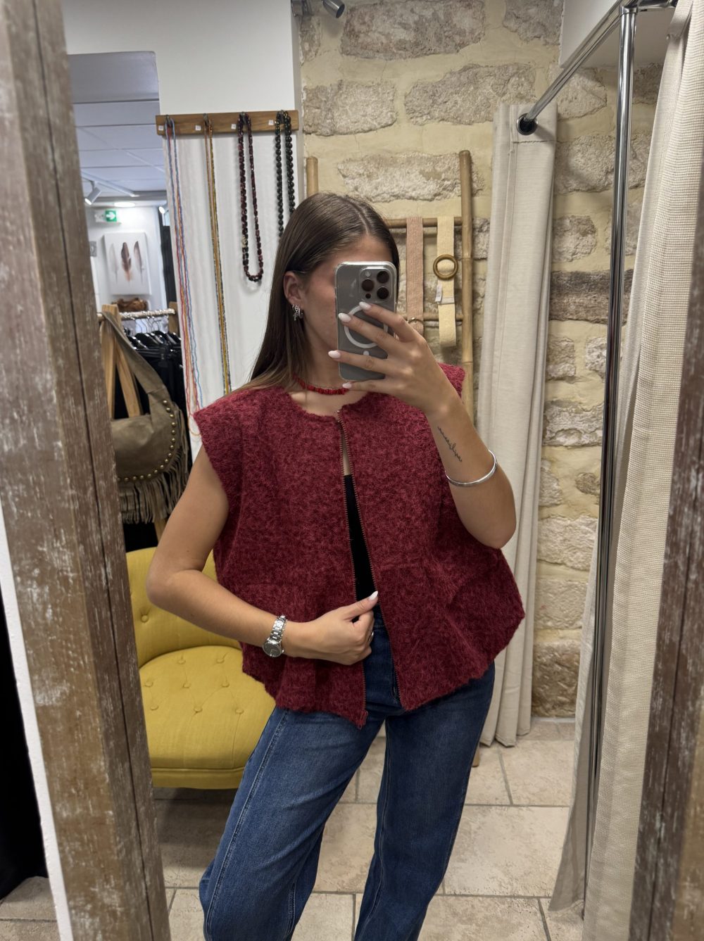 Gilet sans manches en maille bordeaux, fermeture zippée, poches plaquées en volume.